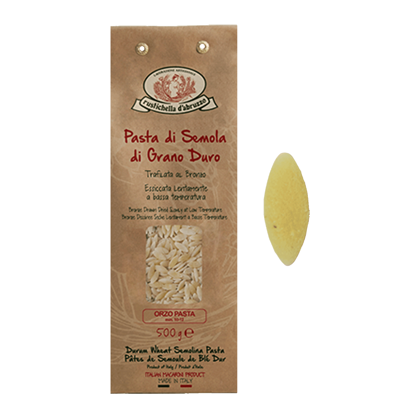 The pasta is made using traditional bronze dies, which give the pasta a rough texture that helps sauces cling to it better. It is then dried at low temperatures for 36 to 50 hours in static drying rooms with regulated humidity to allow the proper fermentation of the semolina and the flavour to fully develop.